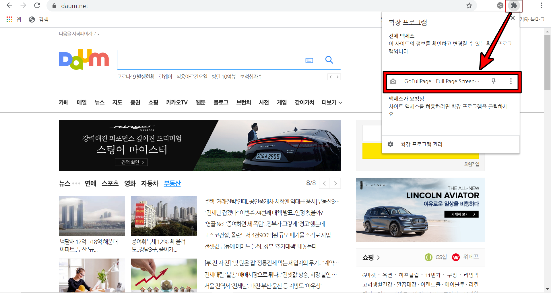 이제 스크롤 캡쳐를 진행하고 싶은 페이지로 이동하여 우측 상단에 보이는 확장프로그램 버튼을 눌러줍니다. 아까 설치했던 앱이 보이는데, 해당 버튼을 눌러주기만 하면 곧바로 캡쳐가 진행됩니다.