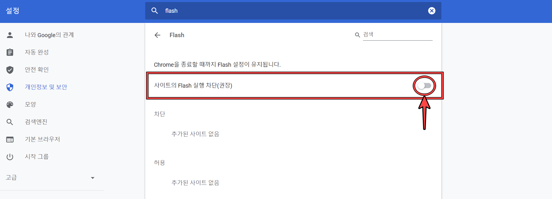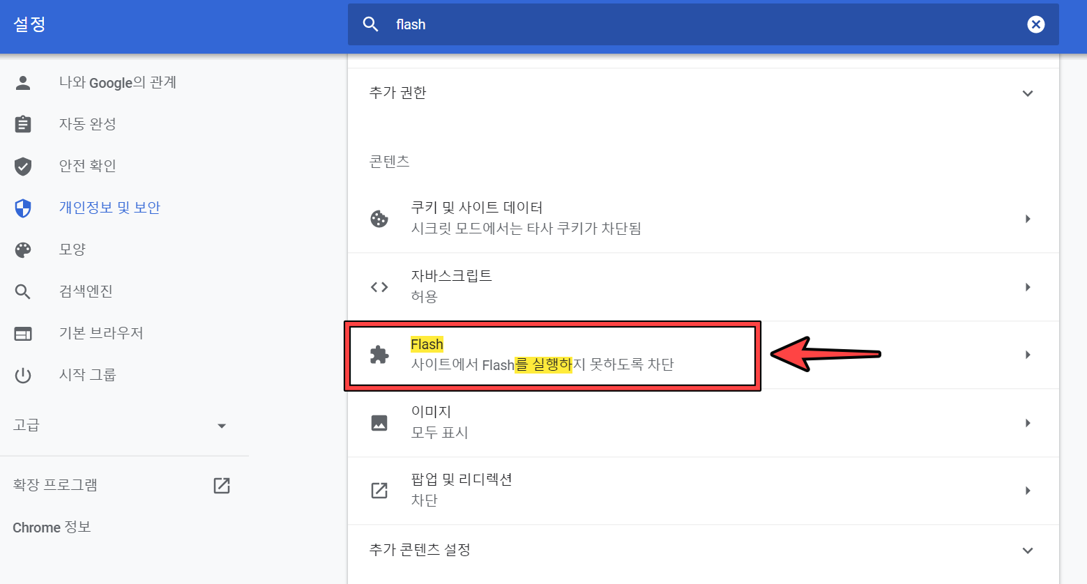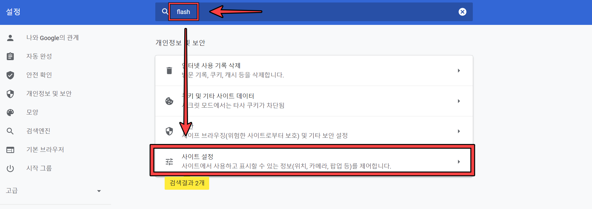 이곳에서 크롬에서 사용되는 각종 설정 사항들을 변경할 수 있습니다. 일단 검색창에 'flash'라고 검색 후, 아래에 보이는 (사이트 설정)으로 들어갑니다.
