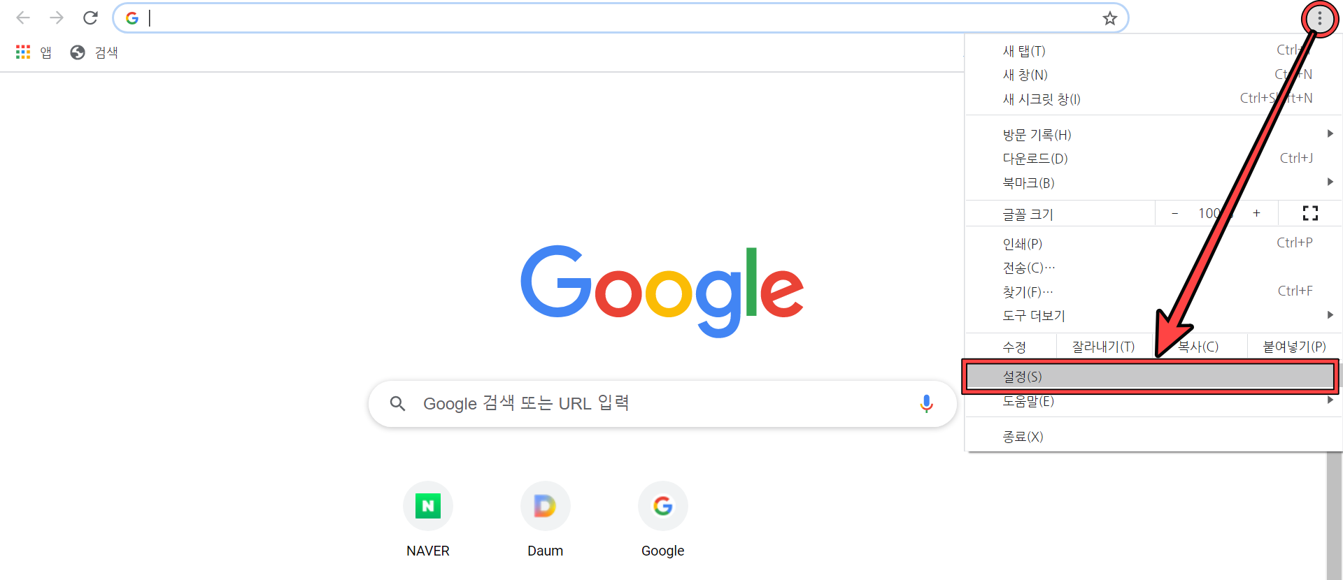 크롬 브라우저에서 우측 상단에 보이는 점세개 모양의 버튼을 클릭 후, (설정)으로 들어갑니다.