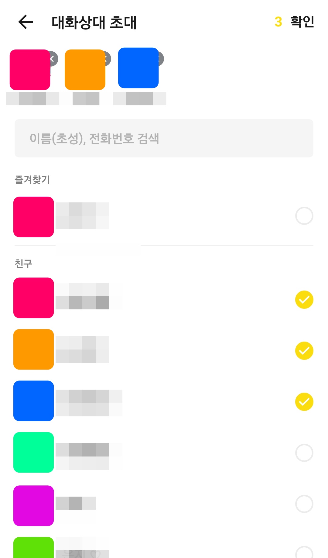 일반채팅 버튼을 누르면 친구에 등록되어있는 사람들 중에 함께 대화할 사람을 선택할 수 있습니다. 1명만 선택하면 1:1 대화를 할 수 있고, 여러명을 선택해서 확인을 누르면 단체방이 만들어집니다. 단, 이 기능은 카톡 친구로 등록되어있는 사람들에 한해서 방을 만들고 사용할 수 있습니다. 만약 친구가 아닌 사람도 초대해서 이야기하고 싶다면 아래에 이어지는 오픈채팅방 사용법을 봐주세요.