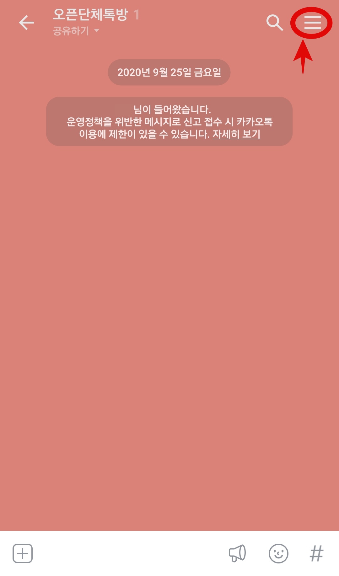 개설이 완료되면 우측 상단에 있는 메뉴 버튼을 눌러봅시다. 그럼 설정 창이 나오는데, 위에있는 점세개 탭을 눌러보시면 오픈 카톡방에 초대할 수 있는 링크나 QR코드 등을 생성해서 보낼 수 있습니다. 이를 통해 친구가 아닌사람도 링크를 통해 방에 참여하여 이야기할 수 있습니다.