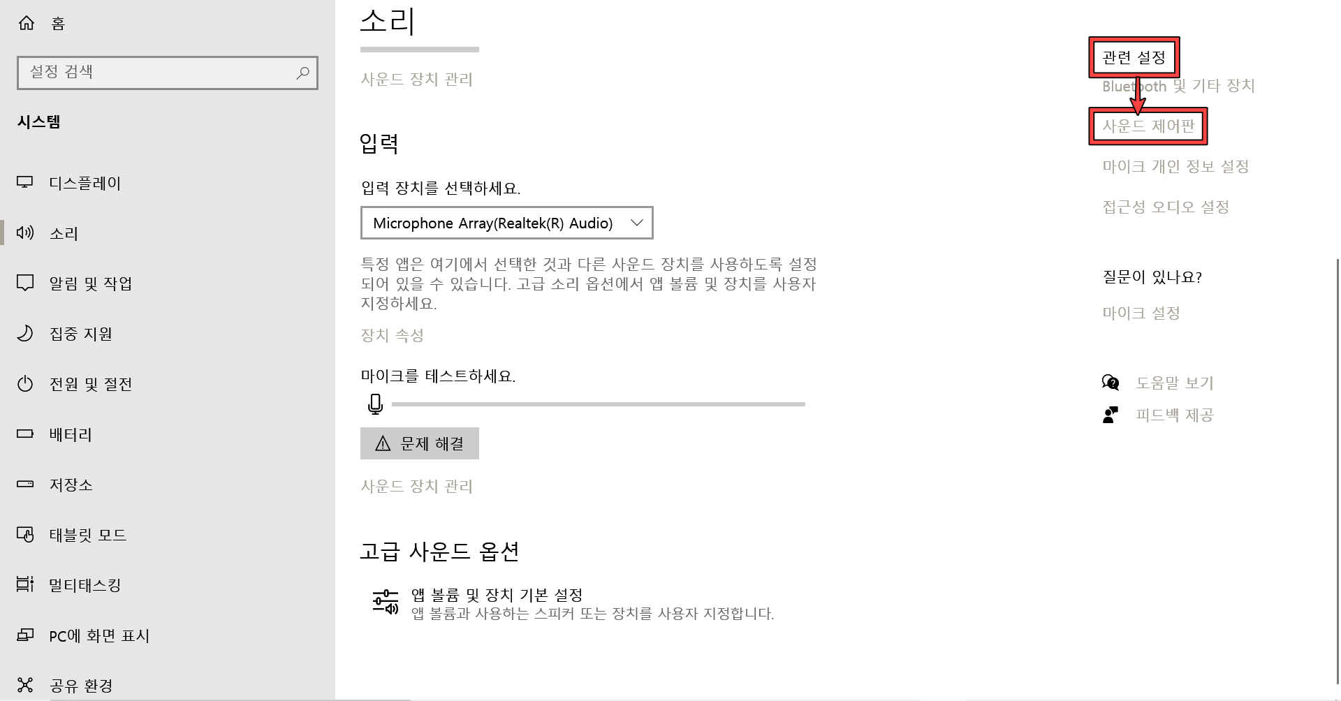 위쪽에는 (관련설정)란이 있는데요, (사운드 제어판)으로 가봅시다.