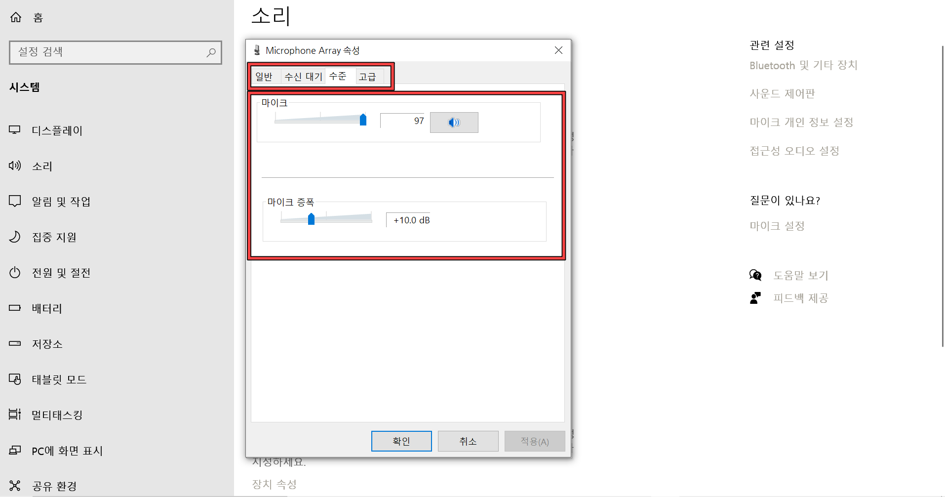 이곳에서 마이크의 음량 수준 및 증폭도를 설정할 수 있습니다. 제품마다 적절한 데시벨이 조금씩 다를 수 있으므로 테스트를 진행해 보시면서 조절해 주시면 됩니다. 볼륨 또한 사용중인 PC나 스피커에 따라 체감 정도가 다르므로, 직접 녹음 및 사용해보시면서 적용해 주시면 되겠습니다.