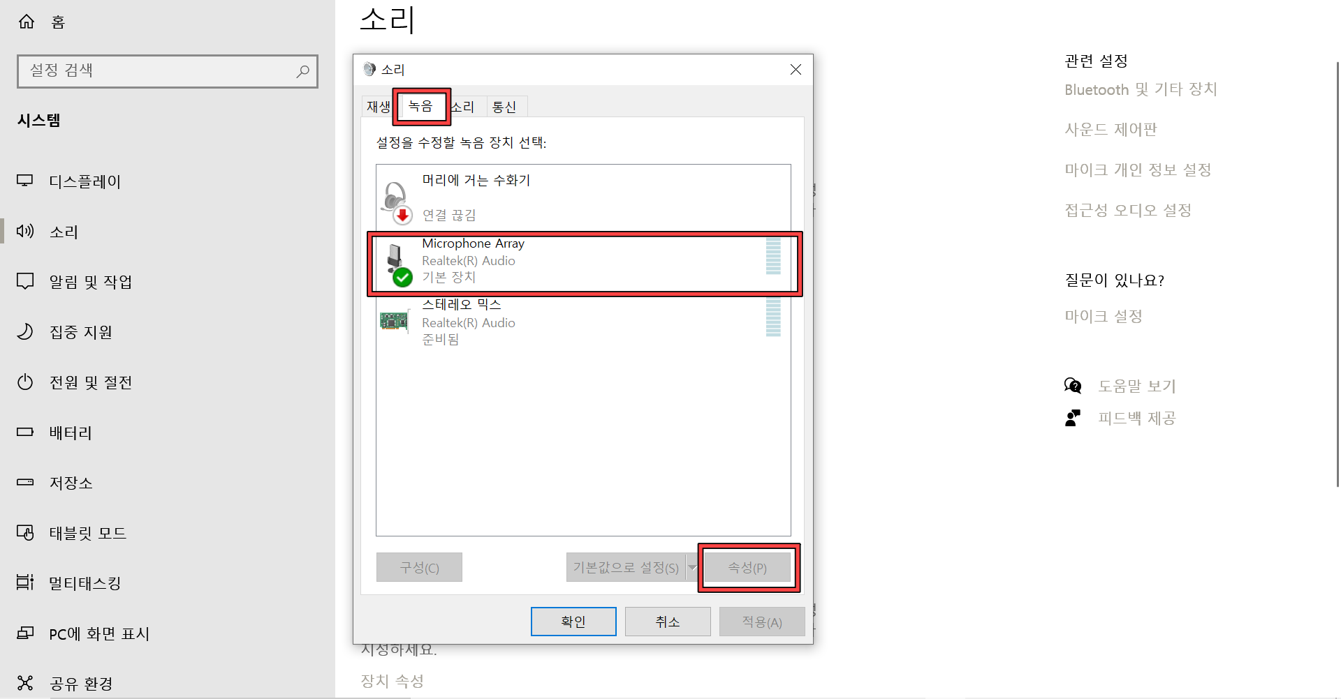 녹음탭을 선택 후 현재 연결되어있는 마이크-속성으로 들어갑니다.