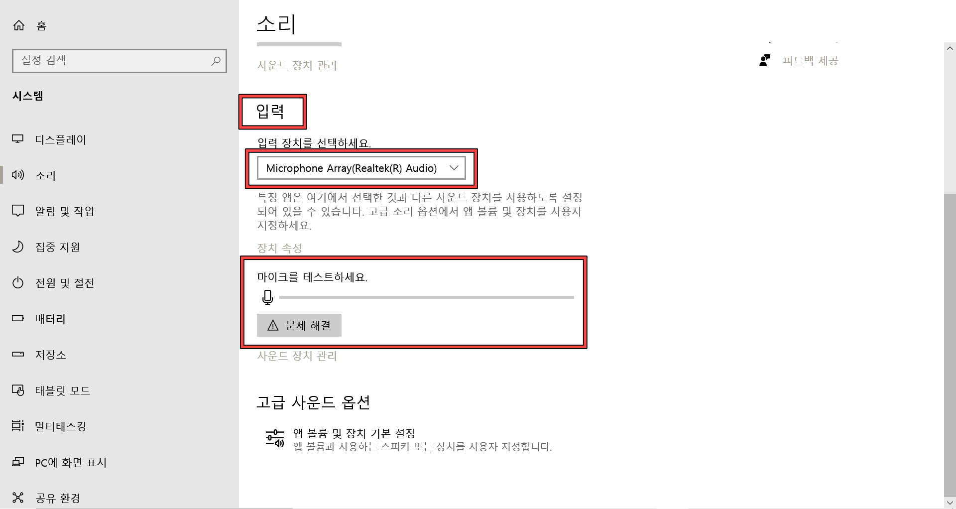 소리 설정에는 출력&입력 두가지를 조정할 수 있는데요, 여기서는 "입력" 항목을 살펴봅시다. 현재 컴퓨터에 연결되어있는 마이크 모델명이 보이며, 이어서 테스트를 위한 부분이 보입니다.