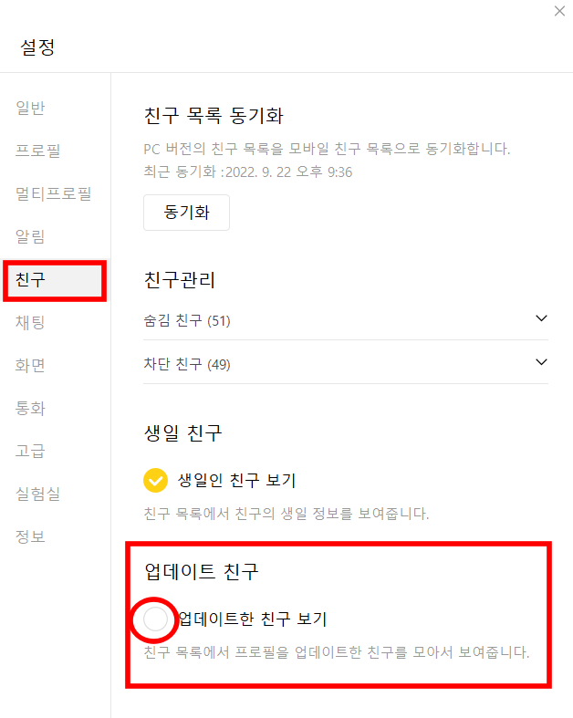 왼쪽 메뉴에서 (친구)를 선택한 뒤, 업데이트 한 친구 보기 기능을 체크해제 하여 비활성화 시켜주면 완료됩니다.