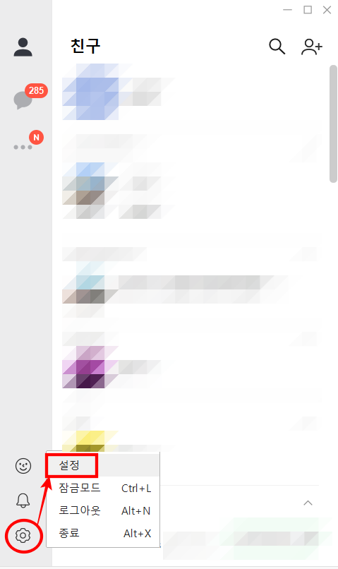 PC버전으로 접속해 주신 뒤, 좌측 하단을 보면 톱니바퀴 모양 버튼이 있습니다. 여기서 (설정)으로 갑니다.