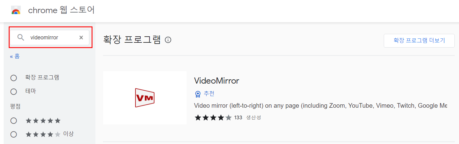 회전 기능 사용 때와 마찬가지로 크롬 웹스토어에서 videomirror를 검색하여(띄어쓰기 없이 해주세요) 확장 프로그램을 추가 하면 됩니다.