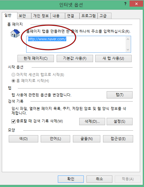 여기서 시작페이지 주소를 확인해 주신 뒤, 원하는 주소를 입력합니다. 이제 브라우저를 껏다가 다시 실행해보면서 설정한 주소로 잘 실행이 되는지 확인해 줍니다.