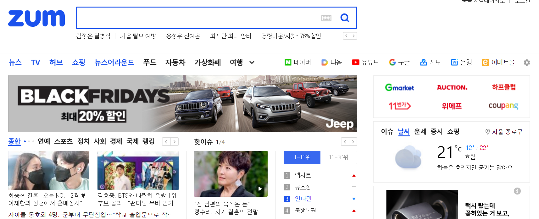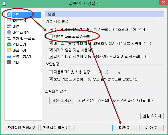 여기서 (일반)- (새탭을 ZUM으로 사용하기)에 체크표시 되어있으면 이것을 해제해 줍니다. 만약 새창을 열때마다 ZUM사이트가 열렸었다면, 이 방법으로 해결이 되셨을 겁니다.