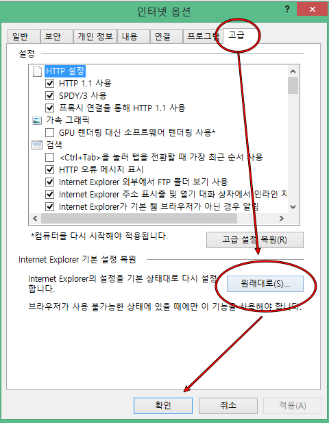 만약 모든 방법을 동원해도 해결이 안되셨다면 인터넷 옵션(고급)-(기본설정)에 들어가서 (원래대로)버튼을 눌러주면 인터넷 설정이 초기화 되면서 문제해결이 되실 겁니다.