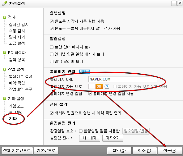 여기서 (기타)-(홈페이지관리)-URL이 ZUM 사이트로 설정되어 있고, 자동 보호 기능이 ON으로 적용되어 있으면, 이것을 바꿔주어야 합니다.(보호 기능의 경우 ON으로 해두면 인터넷 옵션에서 변경해도 시작페이지가 바뀌지 않게끔 해주는 기능입니다) 이제 앞으로 사용을 원하는 시작페이지 주소를 입력하고 자동보호를 OFF 해줍니다.